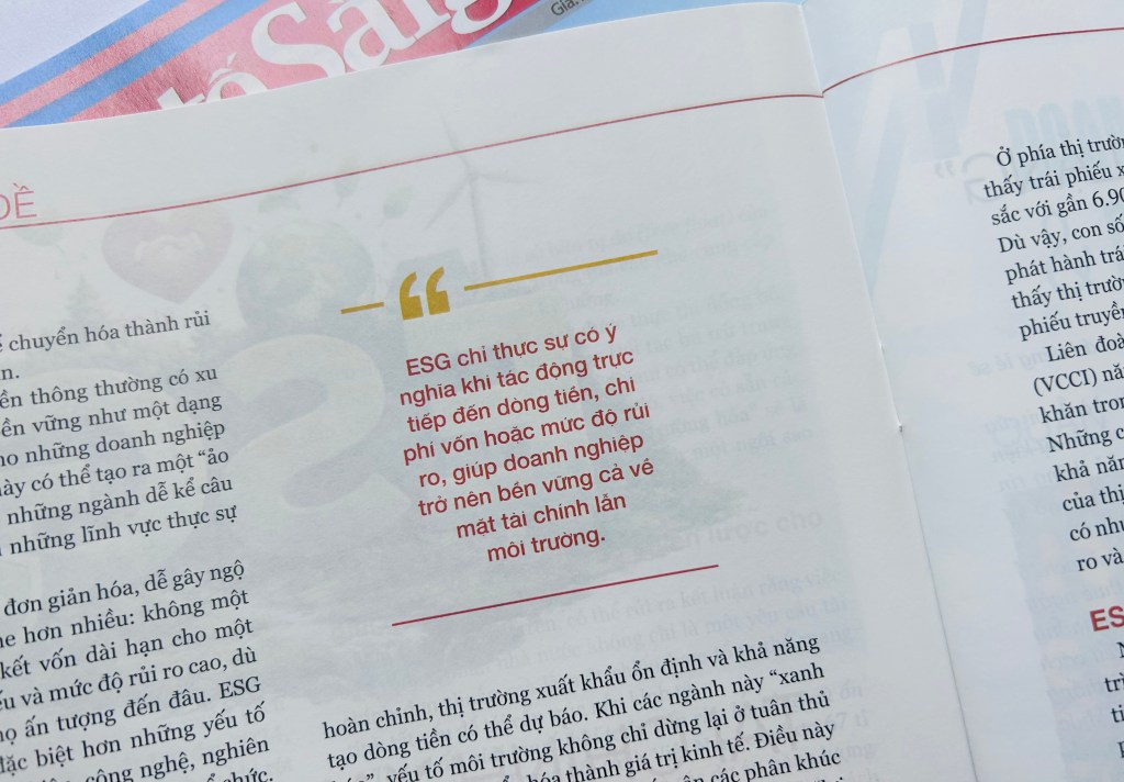 Không một quỹ ESG nào sẵn sàng cam kết vốn dài hạn cho một doanh nghiệp có dòng tiền yếu và mức độ rủi ro cao, dù thành tích môi trường của họ ấn tượng đến đâu. ESG quan trọng, nhưng không đặc biệt hơn những yếu tố quan trọng khác như thương thiệu, công nghệ, R&D, con người hay văn hóa tổ chức.